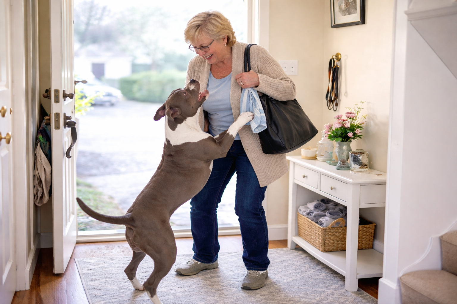 As Grandma walks toward the house, Tish can barely contain herself. The energetic pup wiggles, dances and practically vibrates with excitement while waiting for the door to open.