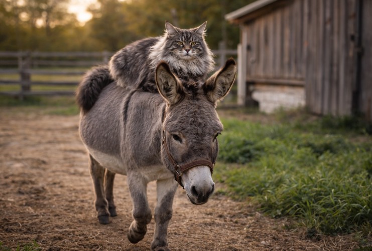 In the viral clip, the fluffy gray Maine Coon doesn’t just walk alongside the donkey — she hops right onto his back like it’s the most normal thing in the world. Draped comfortably across the donkey, the confident cat appears completely relaxed as she enjoys a free ride around the farm.