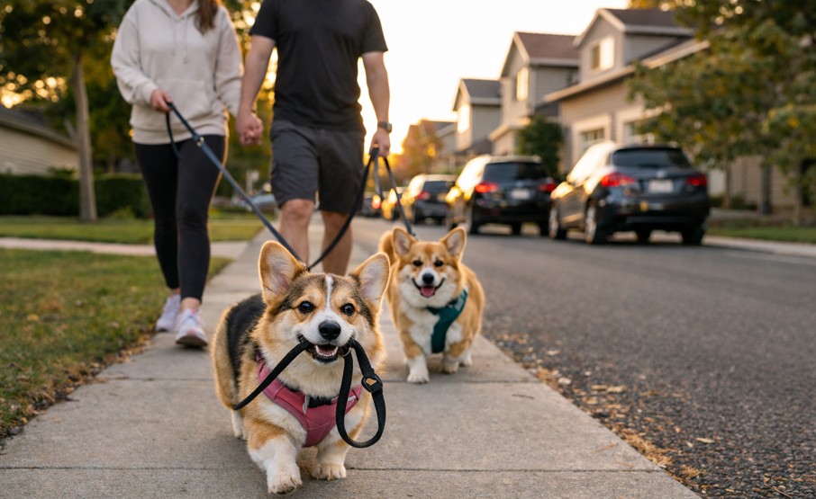 Move over, dog walkers — this Corgi is flipping the script in the cutest way possible.