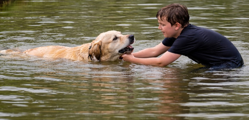 The dog was clearly in trouble, and the boy wasn’t about to wait and see what happened next. He swam out, reached the tired pup, and helped guide him back to safety before things could take a dangerous turn.