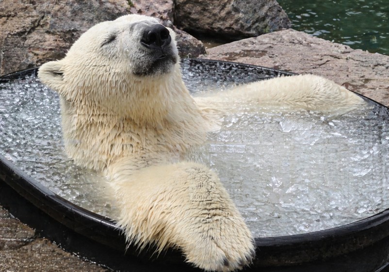In the video, the massive bear casually plops into a tub of icy water like it’s a luxury spa day. He stretches out, splashes around, and fully embraces the chill, looking completely unbothered by the cold. The zoo perfectly captioned the moment “Polar plunge!” — and honestly, that’s exactly the vibe.