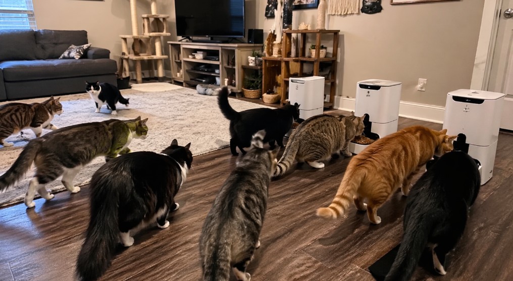The second that familiar sound hits, all eight cats explode into action. They sprint across the room at full speed, turning the once-relaxed space into a full-blown feeding frenzy. It’s fast, chaotic, and honestly kind of impressive.